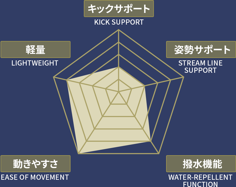 生地や構造によってフラットな姿勢をサポートし、抵抗が少なく効率の良い推進力で速さを追求